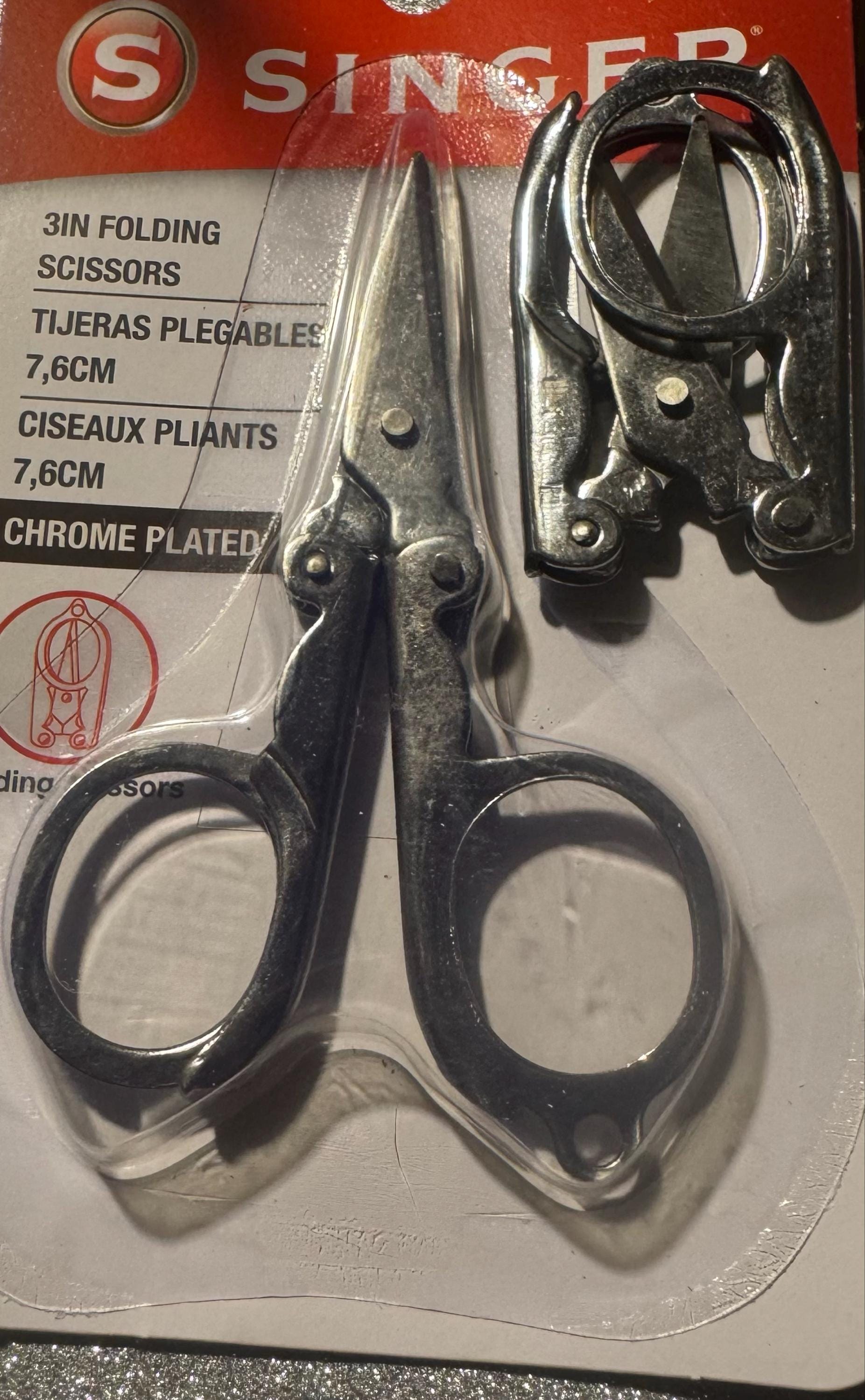 3 pack of Folding Scissors. Less than 2" when folded. Great for traveling and crafting on the go. Use these for your home, office and for travel while working on embroidery, needlecraft or sewing projects. Scissors are chrome plated steel and fold. This package contains one 3-inch pair of folding scissors.