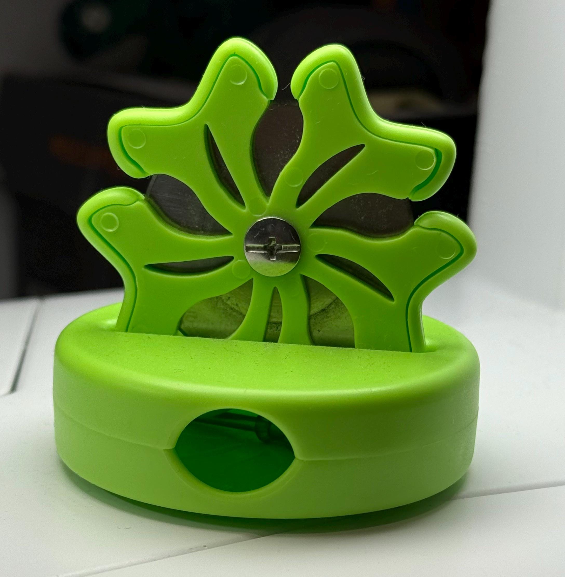 ASSEMBLY: Pretty simple. The plastic case is held together with magnets; pull/twist it apart to open the case. The "flower" inside is held together with a small nut and bolt; this is where the rotary blade goes. Remove screw/nut to open then place a rotary blade in the center and secure by replacing the screw/nut. You'll need a #2 screwdriver to seat your own blade into the compartment. Align the magnets on the case to close it and stick the flower into the groove on the top of the case to hold the flower upright. When done, you can take the flower out of the groove and put it back in the case.