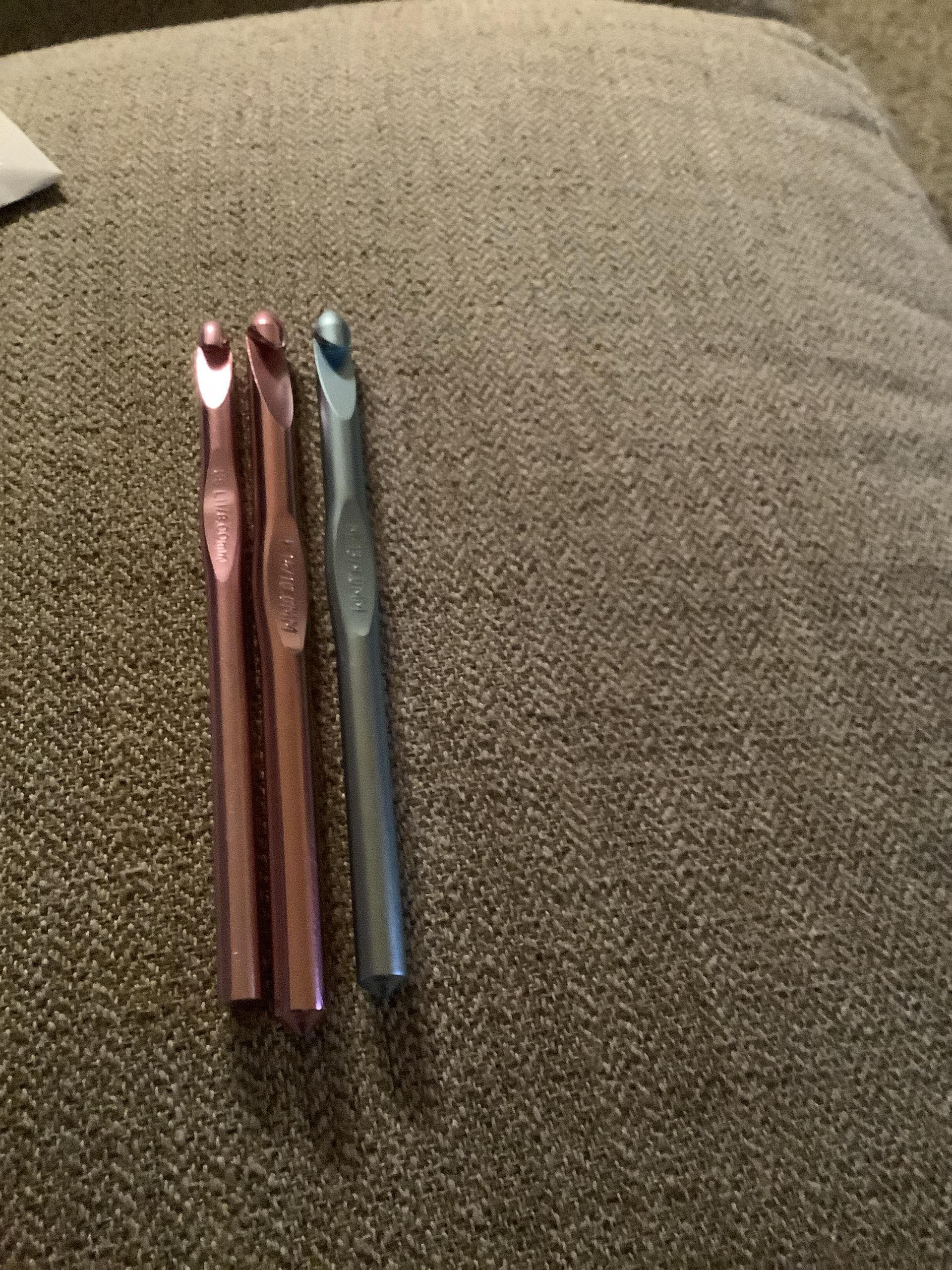 A 3 piece set size L to M of Susan Bate's Soft Ergonomic crochet hooks. These Silvalume crochet hooks are designed for comfort and have gently rounded tips and a long taper to make knitting easier and reduce yarn splitting. Silvalume is the most complete line of color-coded ultra-smooth aluminum crochet hooks & knitting needles to match all your yarns. More details below.