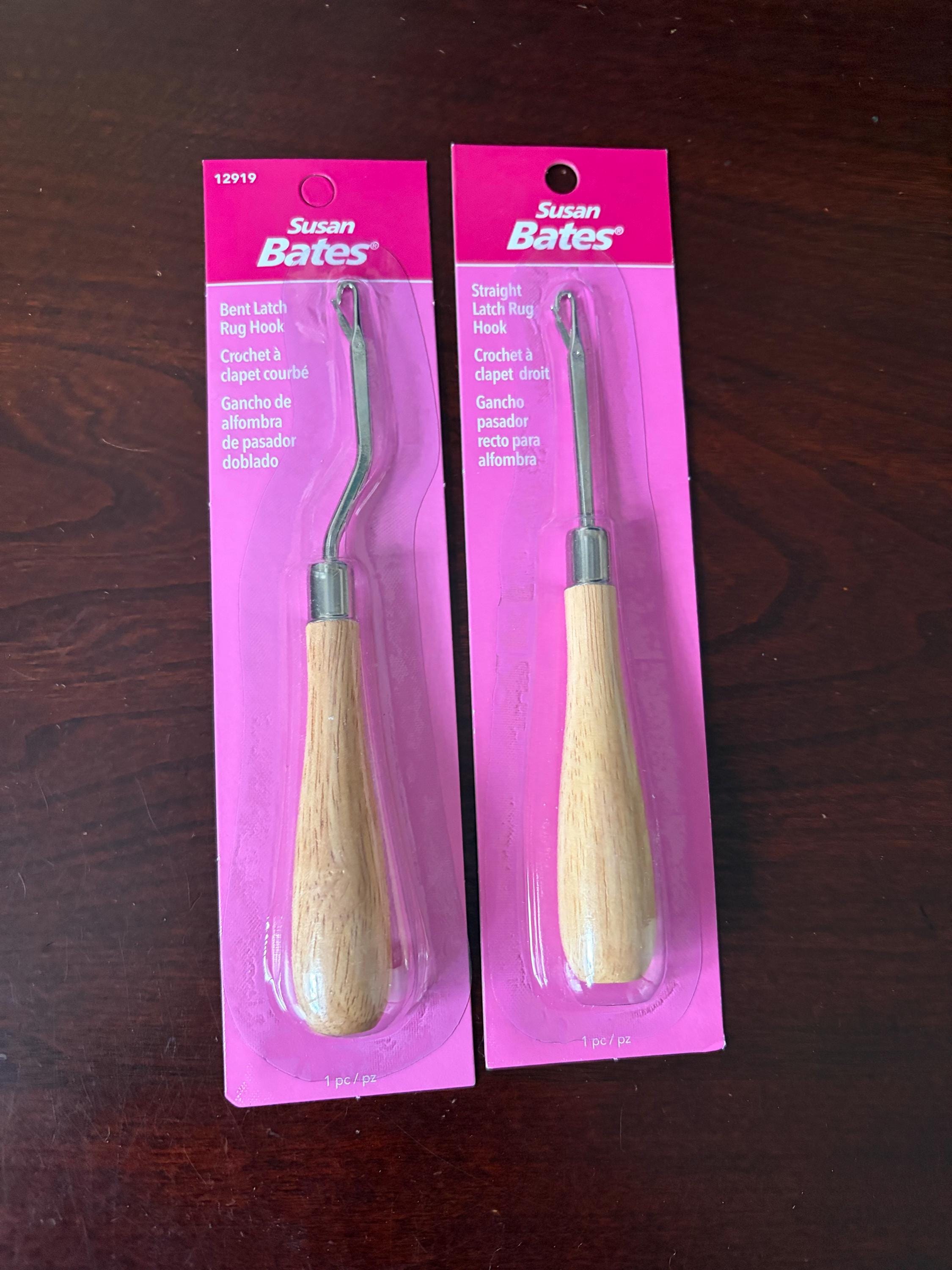 Susan Bates Rug Latch Hook - choose Straight or Bent. A tool commonly used to create latched hook rugs using this hinged hook to form a knotted pile from short, pre-cut pieces of yarn.