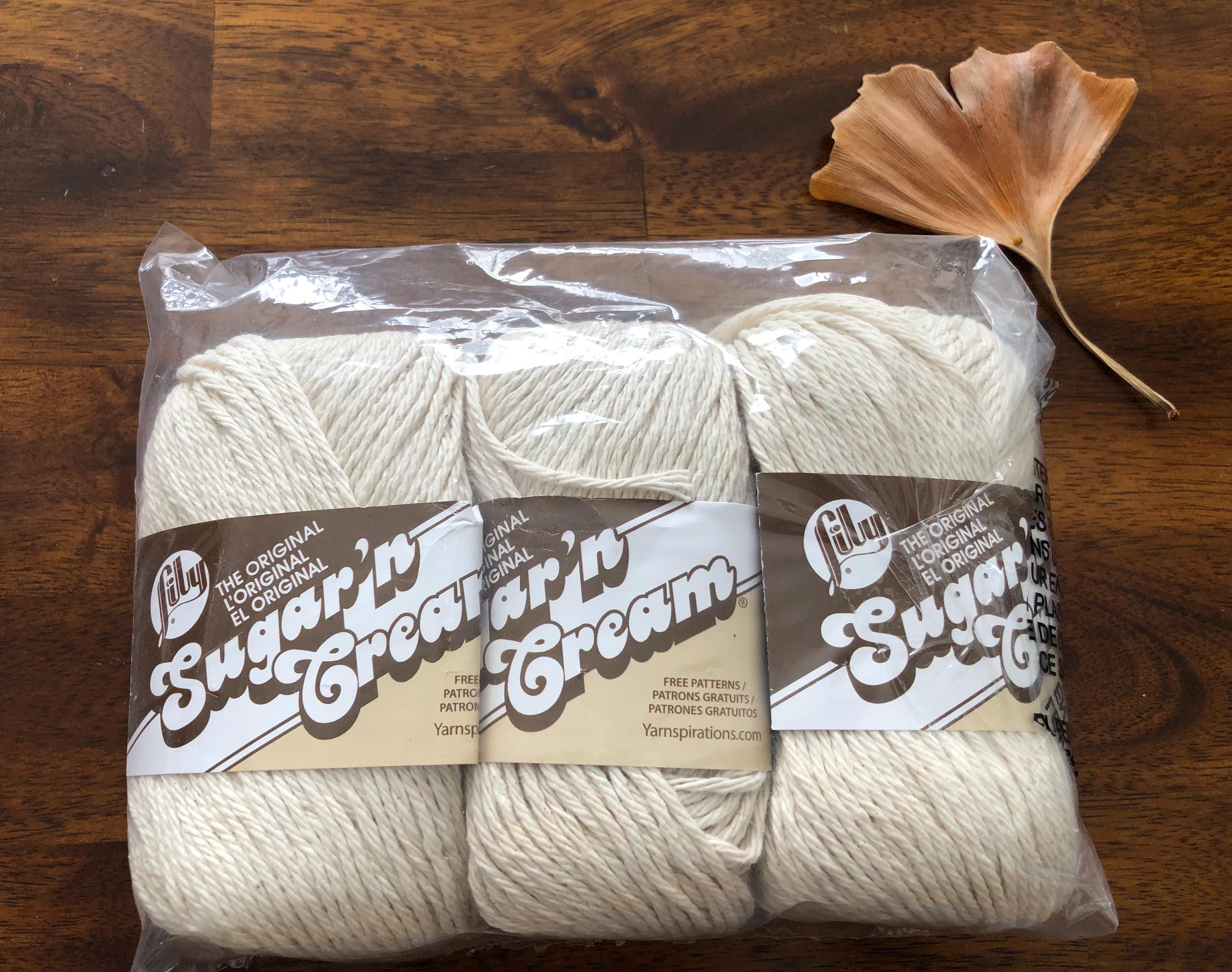 3 skeins of "Ecru" The Original Sugar N Cream Cotton Yarn. Lily® Sugar'n Cream Yarn is made from 100% USA grown cotton which is dyed and spun into a wide variety of colorways and skein sizes. This yarn is known for its exceptional quality, absorbing power, and large variety of colors. This classic worsted weight cotton yarn is recognized for working up super absorbent dishcloths, home decor, summer knitwear and craft projects.