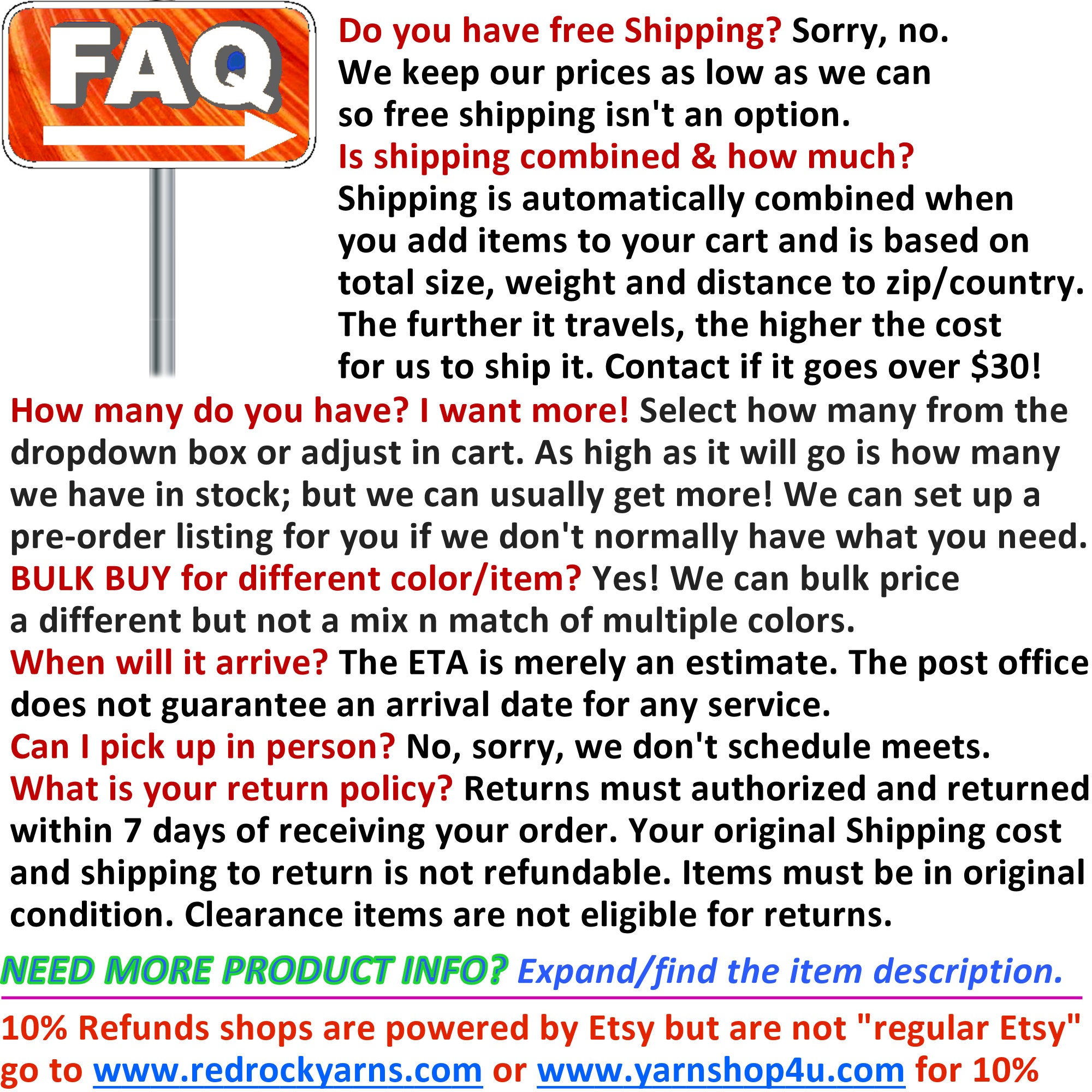 • REFUNDS are issued by Etsy. Returned item MUST be in the original condition as received; they CANNOT be used in anyway. Yarn is weighed before we ship; don't use and return